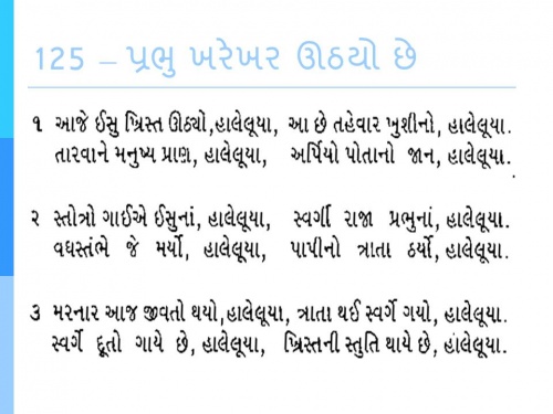 | 3 | Marnaar aaj jeevato thayo, Hallelujah, traataa thai swarge gayo, Hallelujah. |