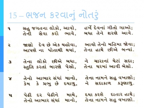 | ૧ | સહુ જગતના લોકો, આવો, | હર્ખે દેવનાં ગીતો ગાઓ; |